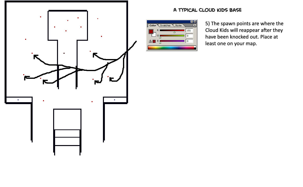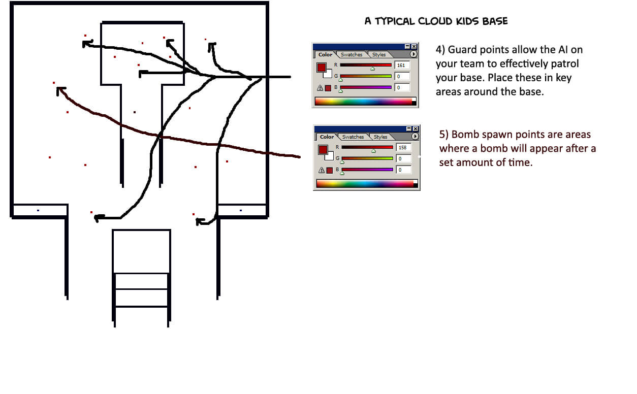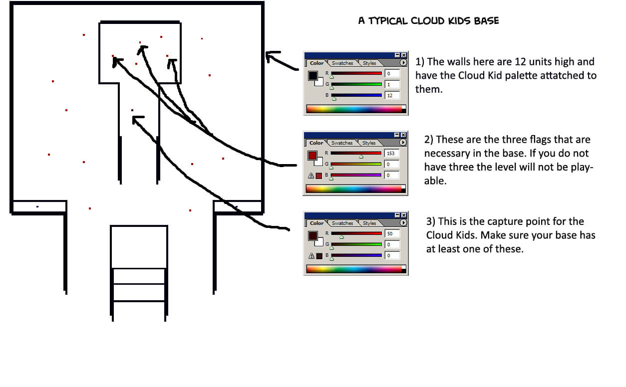 The basics to keep in mind while creating these levels is that the three different color channels (red, green, blue) do very separate actions. You will be using the three channels in harmony to create your level. Following is a run down of the channels and what they do to create the level.